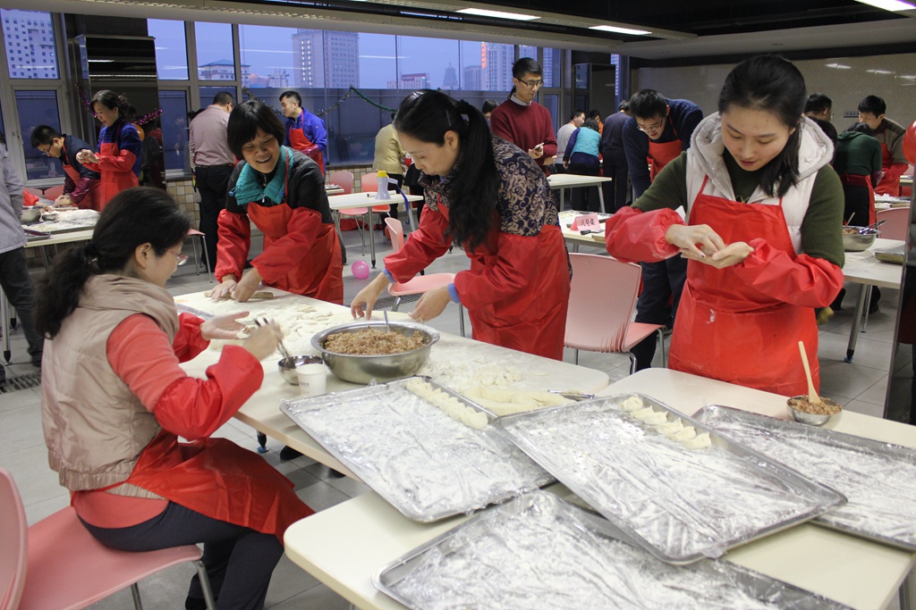 本次活動(dòng)包括背對背運氣球、你比我猜、摜蛋、包餃子四個(gè)項目。在背對背運氣球比賽中,各小組配合默契,小心翼翼地背靠背夾著(zhù)氣球,爭先恐后地向終點(diǎn)跑去;你比我猜考驗的是團隊的協(xié)作與反應能力,一人比劃一人猜題,比賽緊張激烈,不僅有90秒猜對13道題的超級心有靈犀、還有那些錯猜的滑稽表演,引起了觀(guān)眾的陣陣笑聲;摜蛋比賽中,選手們沉著(zhù)冷靜,氣氛緊張而愉快,體現了和諧快樂(lè )的比賽精神;最后一個(gè)環(huán)節是包餃子,大家更是熱情滿(mǎn)滿(mǎn),各小組分工有序,揉面的揉面,搟皮的搟皮……